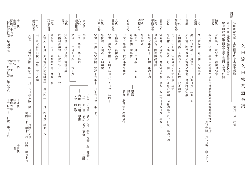 以上は久田家発祥より三代宗全に至るまでの概観であって、これだけでも久田家は表千家と密接な関係にあることがわかるが、宗全の代になって、再びその長子原叟宗左が随流斎の嗣となっている。これが表千家で重きをなしている覚々斉である。次いで如心斉を経て啐啄斎に至った時三度久田家より入って之を嗣いでいる。これが6代宗渓の長子宗左すなわち了々斉である。
